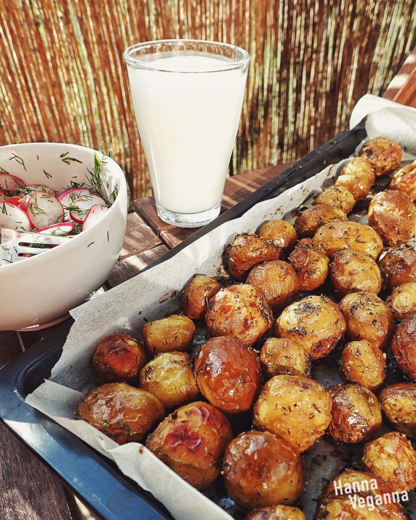 До айрану приготувала запечену молоду картоплю зі шкіркою, змащену оливковою олією, з сіллю, чорним перцем та чабрем. Запікала це все 40 хв.