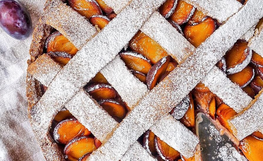 6. На підпечений корж викласти всі сливи. З решти тіста зробити смужки та викласти їх на сливи у вигляді сітки. Випікати при температурі 180°C 40 – 50 хвилин.